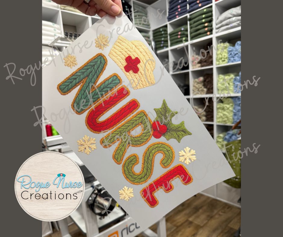 NURSE Faux Yarn Graphic Print T-Shirt, Nurse Crew Holiday T-Shirt, Nurse Gift, Cute Faux Knitted Nurse Christmas Shirt for The Holidays