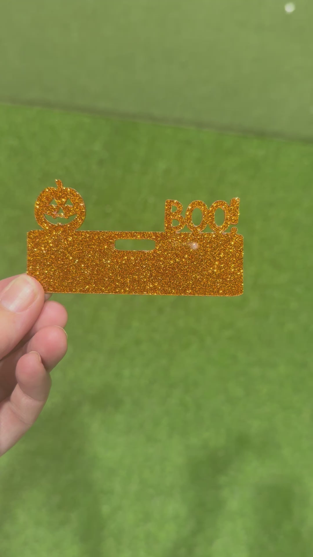 Cute fall orange glitter Pumpkin with on the right side acrylic badge topper. Boo! Add some holiday flair to your name badge with this laser cut glitter acrylic badge topper! These badge toppers are made in my shop with my Co2 laser. They are cut using 1/8th inch glitter acrylic.